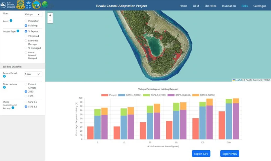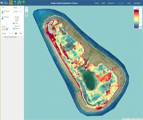 Comprising several tools in one dashboard, the platform covers all nine of Tuvalu’s atolls and islands. It includes inundation modelling due to sea level rise and storm waves, shoreline change detection and monitoring, damage and loss, and tools to identify marine hazards exposure.